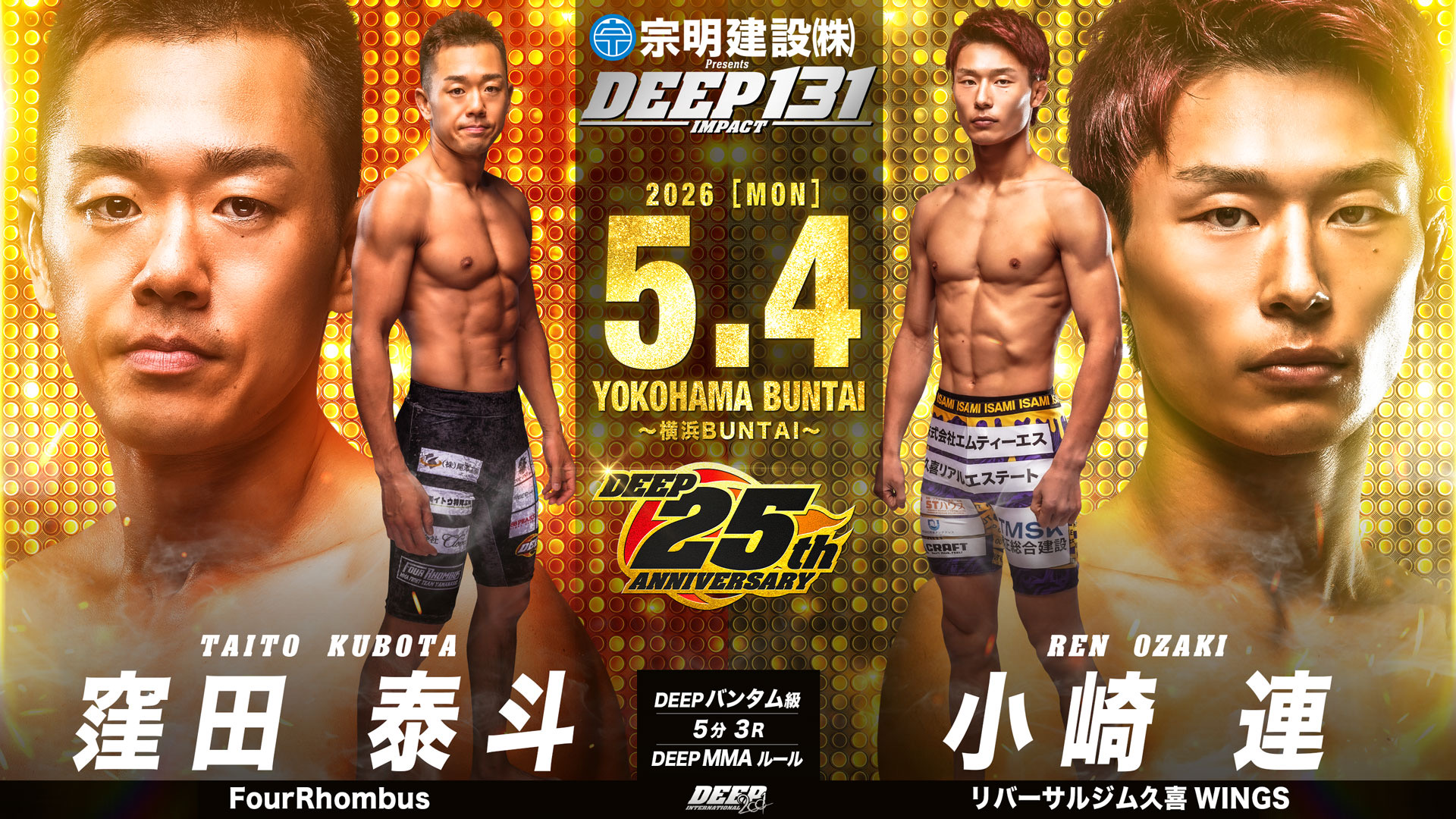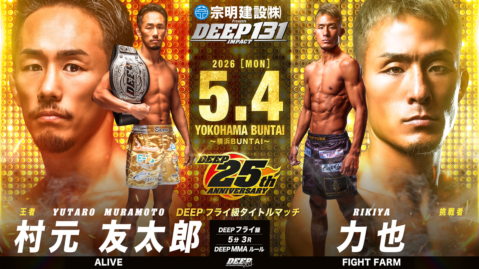 激戦を制した力也が村元友太郎の持つフライ級のベルトに挑戦、KENTAと関原翔の親友対決に小崎連が窪田泰斗相手に再起戦。杉野亜蓮VSダイヤの期待の若手同士の対戦などDEEP 131 IMPACTの追加カード決定!! -