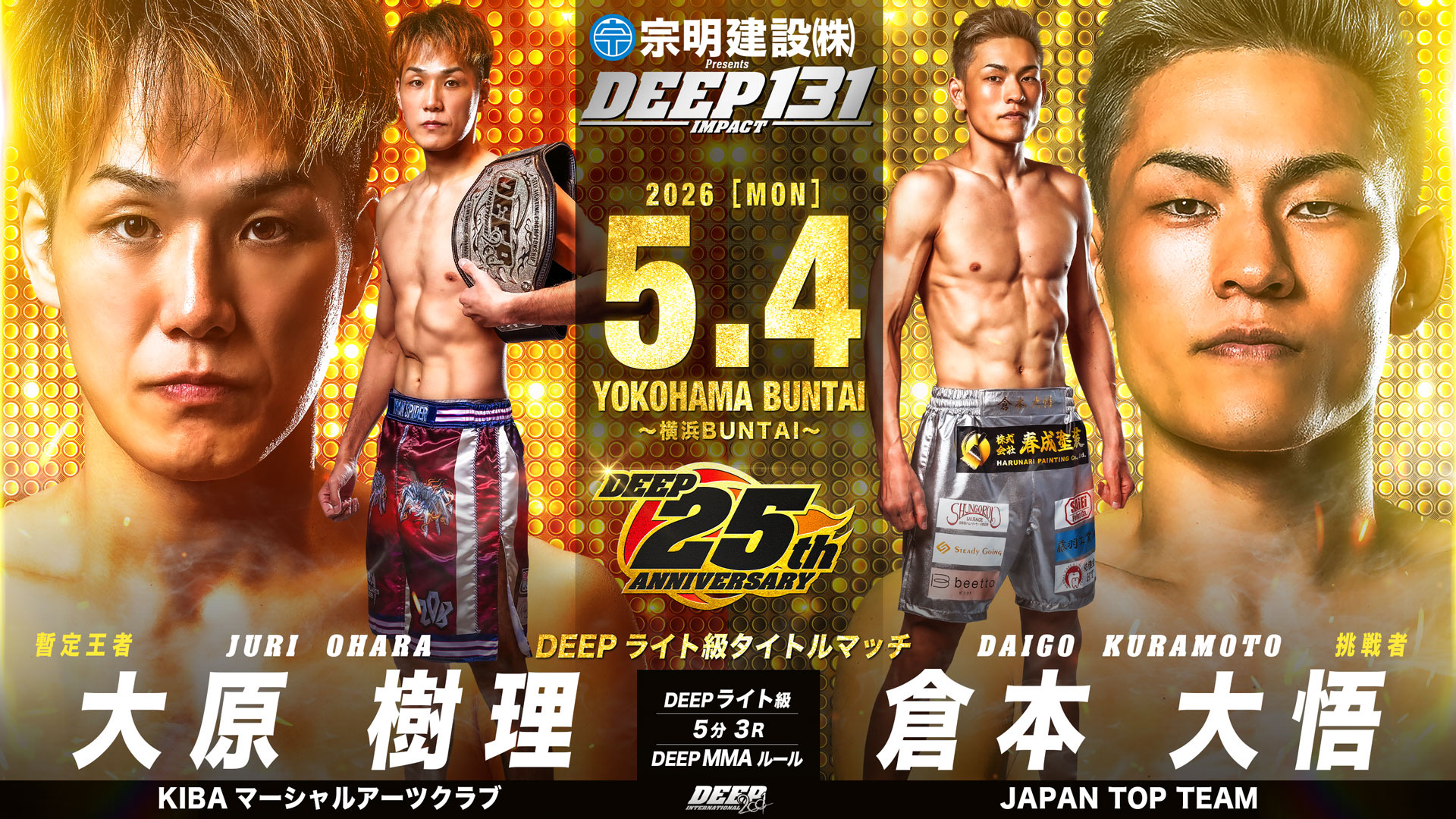 不完全燃焼となった大原樹理 VS 倉本大悟のリマッチにPFLで勝利した泉武志が1年10カ月振りの凱旋で6戦無敗のJTTの秘密兵器・山本颯志を迎え撃つなど注目のDEEP 131 IMPACTの追加カードが決定!! -