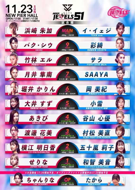 メインは女王・浜崎朱加が大島沙緒里を破ったイ・イェジ相手に再起戦にセミは元ストロー級王者のパク・シウが階級を下げ彩綺を迎え撃つなど今週末に開催のDEEP JEWELS 51の試合順が決定。U-NEXT、サムライTV、DEEP/DEEP JEWELSメンバーシップで配信でゲスト解説は万智!