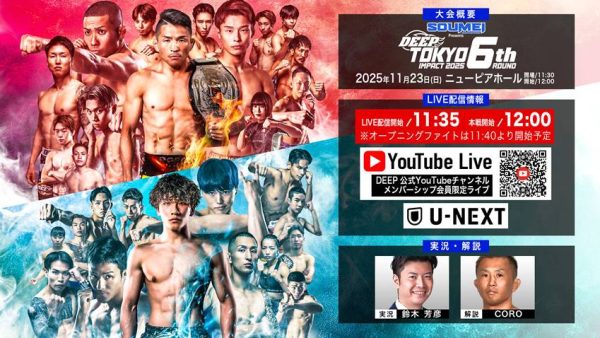メインは20歳の元キック王者の杉山空がMMA3戦目で6連勝中の越智晴雄に挑むストロー級タイトル戦に小崎連と中務太陽のバンタム級期待の新鋭同士が激突などDEEP TOKYO IMPACT 2025 6th ROUNDの試合順が決定。U-NEXT、DEEPメンバーシップで配信、COROがゲスト解説でチケットは立見を含め全て完売で当日券の販売は無し!