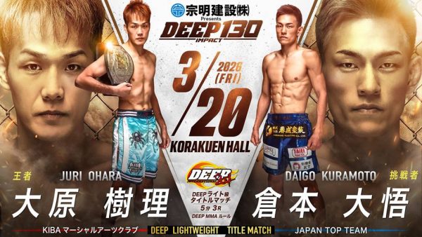 メインはDEEPで7連勝中の倉本大悟が大原樹理に挑むライト級タイトル戦、セミは嶋田伊吹とストラッサー起一の因縁のタイトル戦などDEEP 130 IMPACTの試合順が決定。U-NEXT、DEEPメンバーシップで配信でゲスト解説は村元友太郎、山田聖真。チケットは指定席完売で立見を販売中!