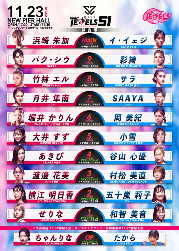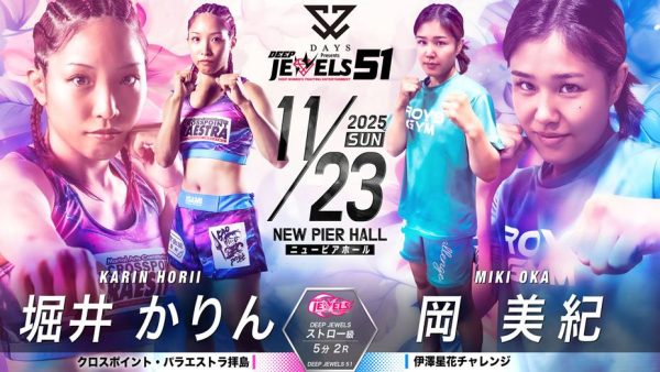 浜崎朱加が大島沙緒里を破ったイ・イェジ相手に再起戦にパク・シウが階級を下げて彩綺を迎え撃つなどDEEP JEWELS 51の前日計量は全選手がクリア。立見券を当日に販売!U-NEXT、サムライTV、DEEP/DEEP JEWELSメンバーシップで配信!!