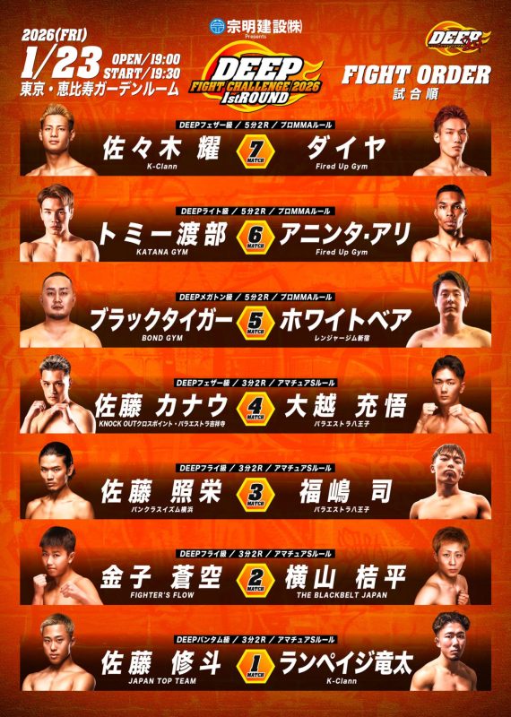 2026年1月23日(金)に恵比寿ガーデンルームで開催する『DEEP FIGHT CHALLENGE 2026 1st ROUND』の試合順がをが決定いたしました。