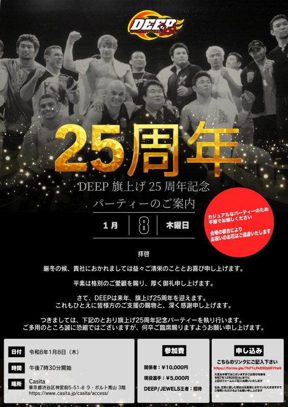 選手、関係者の皆さまへ、DEEP旗上げ25周年記念パーティーのご案内になります。